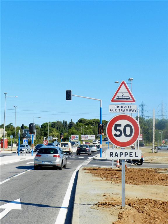 Nouvelle signalisation routière, route de Sète à Saint-Jean-de-Védas, photographiée le samedi 12 août 2017. Copyright : Anje34