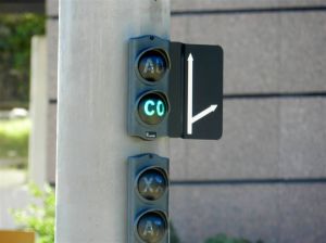 – La signalisation est commandée par la conductrice ou le conducteur de la rame qui, à partir du moment où elle ou il a choisi sa direction laquelle s’affiche en vert (AU ou CO d’une part ou LB ou SA d’autre part, dû côté de la place du 11 Novembre à Montpellier), circule à vue et doit respecter la priorité à droite à la hauteur du point limite de priorité (PLP).