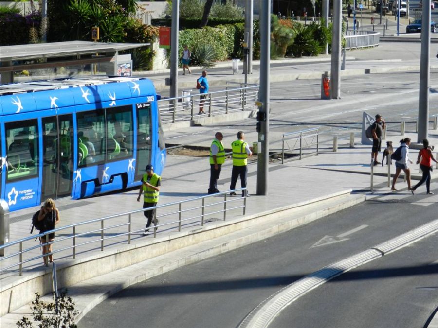 Station « Corum », au bout du quai directions « Odysseum » de la ligne 1 et « Garcia Lorca 4a », du personnel TaM Montpellier 3M est là pour donner un petit coup de clef en commande manuelle au cas où la nouvelle signalisation viendrait à dysfonctionner au premier jour de sa mise en service. Photo prise le lundi 21 août 2017. Copyright : Anje34