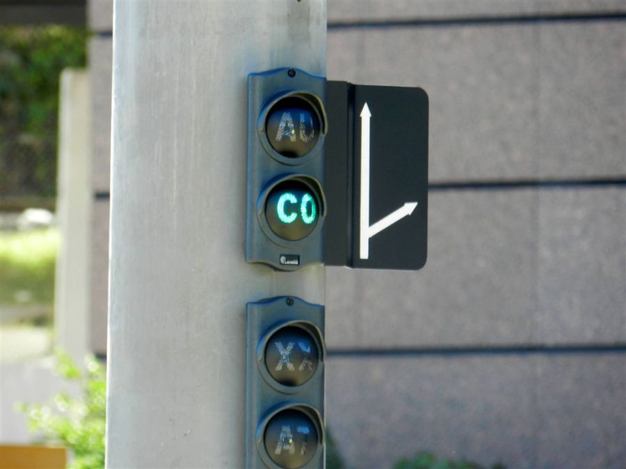 Nouvelle signalisation tramway lumineuse au bout du quai de la station « Corum », lignes 1 et 4, directions « Odysseum » et « Garcia Lorca 4a ». CO indique « Comédie » et « AU « Les Aubes ». Même topo, quai direction « Saint Jean de Védas – Centre » de la ligne 2. A l’opposé du carrefour, la signalisation lumineuse propose LB pour « Louis Blanc » et SA pour « Notre-Dame de Sablassou ». Photo prise le lundi 21 août 2017. Copyright : Anje34