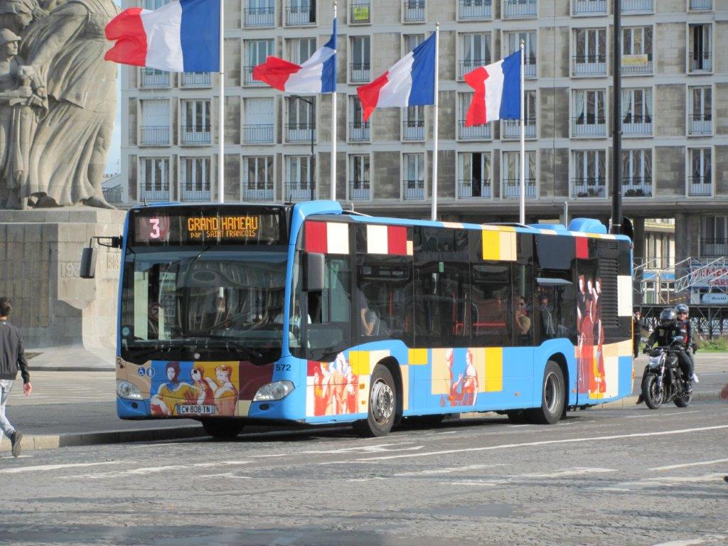 Au Havre, le bus 572 Citaro Mercedes, à la décoration originale, est photographié rue de Paris, le samedi 19 août 2017. Copyright : Edouard Paris