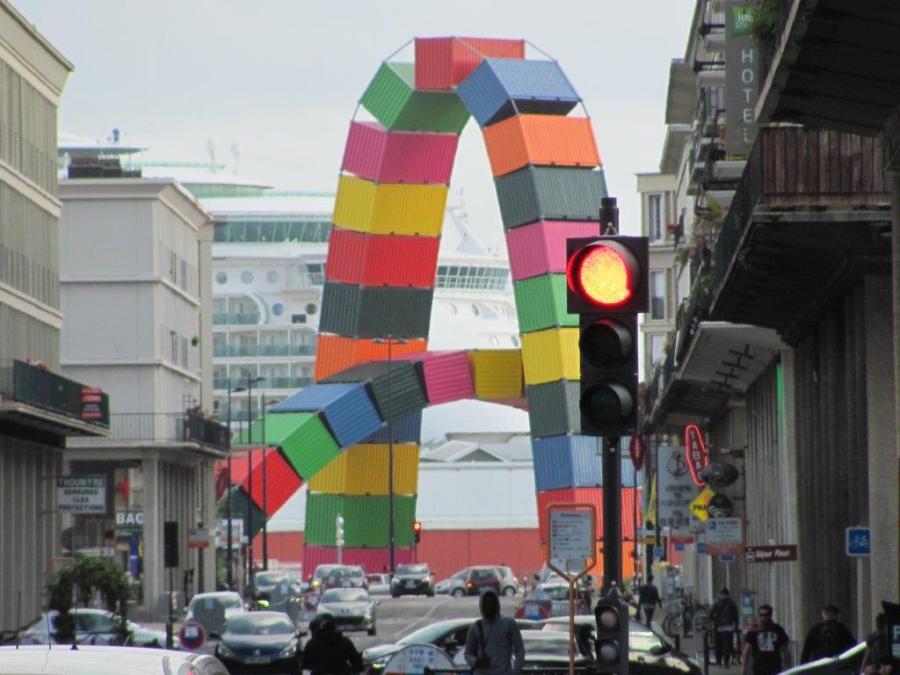 Quai de Southampton, tout au sud de la rue de Paris, La Catène de containers, l’oeuvre monumentale et emblématique des 500 ans du Havre, signée Vincent Ganivet, photographiée le samedi 19 août 2017. Copyright : Edouard Paris