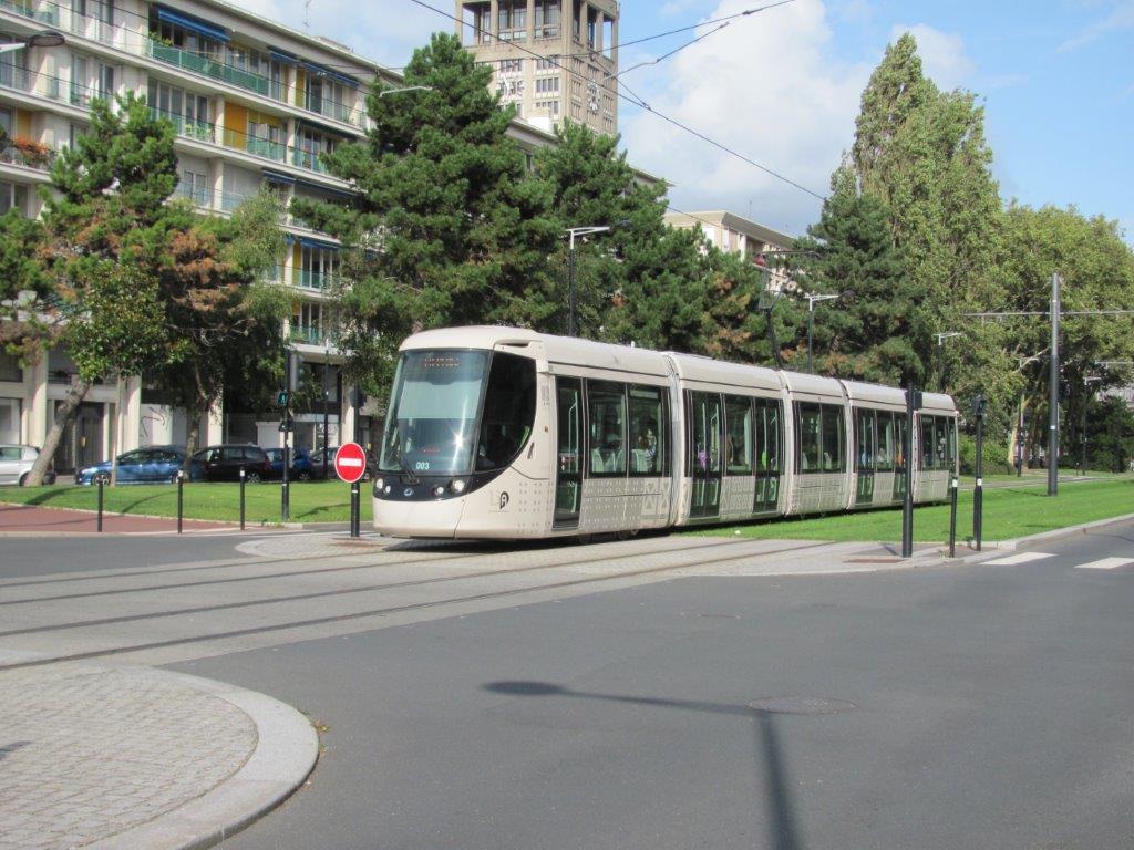 Au Havre, la rame 003 Citadis 302 Alstom, à destination du terminus « La Plage », est photographiée avenue Foch, sur le tronc commun des lignes A et B, le samedi 19 août 2017. Copyright : Edouard Paris