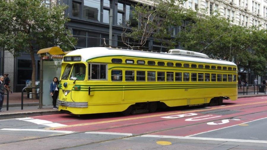 Motrice PCC 1050 Class numérotée 1057 revêtue de la livrée Cincinnati, Ohio, photographiée le lundi 21 août 2017 dans Market Street à San Francisco, à proximité de Powell Street. Copyright : DS7