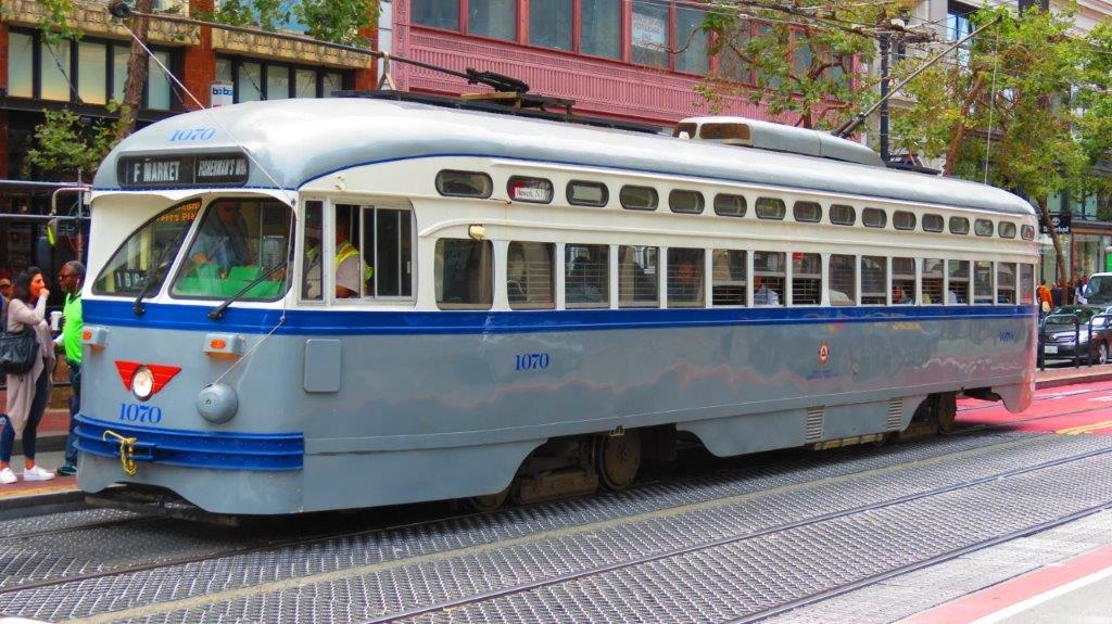 Motrice PCC 1070 Class numérotée 1070 revêtue de la livrée Newark, New Jersey, photographiée le lundi 21 août 2017 dans Market Street à San Francisco, à proximité de Powell Street. Copyright : DS7