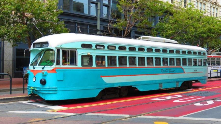 Motrice PCC 1070 Class numérotée 1076 revêtue de la livrée Washington D.C. Transit, photographiée le lundi 21 août 2017 dans Market Street à San Francisco, à proximité de Powell Street. Copyright : DS7