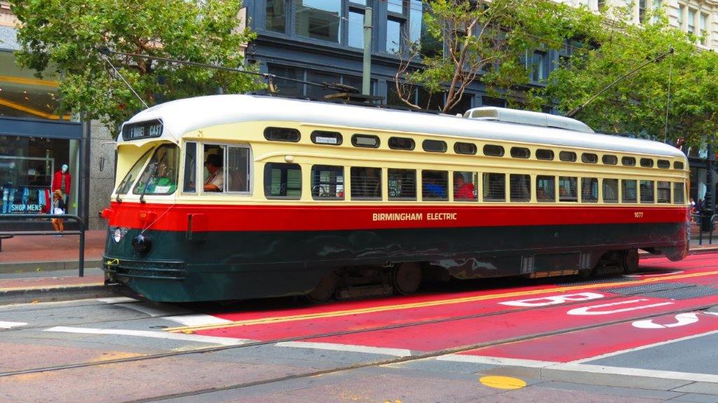 Motrice PCC 1070 Class numérotée 1077 revêtue de la livrée Birmingham Electric, Alabama, photographiée le lundi 21 août 2017 dans Market Street à San Francisco, à proximité de Powell Street. Copyright : DS7