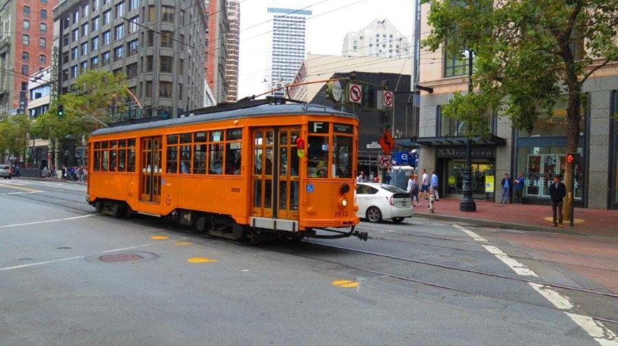 Motrice Peter Witt Class numérotée 1815 revêtue de la livrée de son réseau d’origine, Milan, Italie, photographiée le lundi 21 août 2017 dans Market Street à San Francisco, à proximité de Powell Street. Copyright : DS7