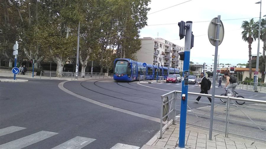 Une rame Citadis 402 Alstom de la ligne 1, opérant exceptionnellement sur la ligne 2, vient de quitter la station « Mas Drevon » en direction du terminus « Jacou », le vendredi matin 15 septembre 2017. Copyright : Anje34