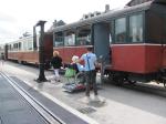 - En gare de Saint-Valery-sur-Somme (Port), les voitures voyageurs et fourgon à bagages suisses attendent sagement la locomotive qui les conduira jusqu’au Crotoy, le mardi 15 août 2017. Copyright : Edouard Paris