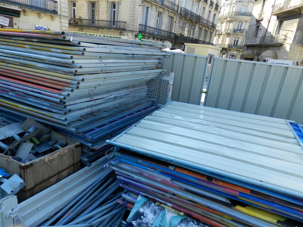 Place Alexandre-Laissac à Montpellier, des palissades stockées dans un carré formé par des palissades. Photo prise le mercredi 27 septembre 2017. Copyright : Anje34