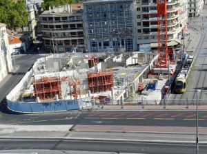 Voici quatre photos, prises au mois de septembre 2017, qui témoignent de l’avancement des travaux du chantier « Hôtel St-Roch – Belaroia », face au parvis Pierre-Brossolette de la gare Saint-Roch devant lequel circulent les rames des lignes 2 et 4 de tramway.