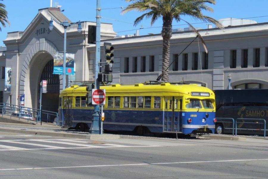 Motrice PCC « Big Ten » Class numérotée 1010 revêtue de la livrée des années 40 San Francisco Municipal Railway, photographiée le mercredi 27 septembre 2017 à la hauteur de la station « Washington Street & The Embarcadero », commune aux lignes E et F, à San Francisco. Copyright : DS7