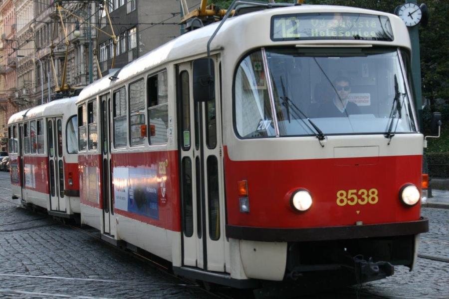 A Prague, la motrice 8538 T3R.P UDDP (2007) ex 6894 T3 ČKD Tatra (1974) est photographiée le vendredi 29 septembre 2017 au carrefour de Ujezd et Vitezna. Copyright : Christophe Clément