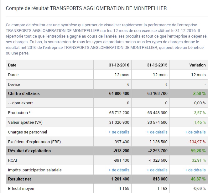 Compte résultat TaM Montpellier 3M 2016-2015. Capture d’écran societe.com (13/10/2017)