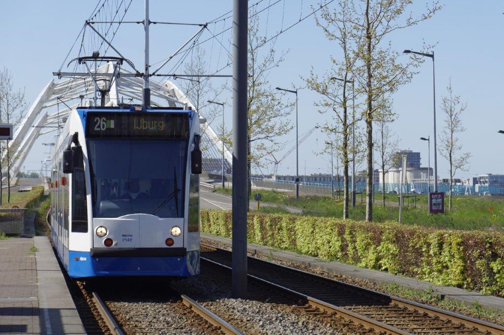 A Amsterdam, la rame 2142 de la série 13G/C1A Combino Siemens est photographiée à l’approche de la station « Steigereiland » qui dessert un quartier résidentiel construit sur une île artificielle. Photo prise le lundi 8 mai 2017. Copyright : Yvon Brument