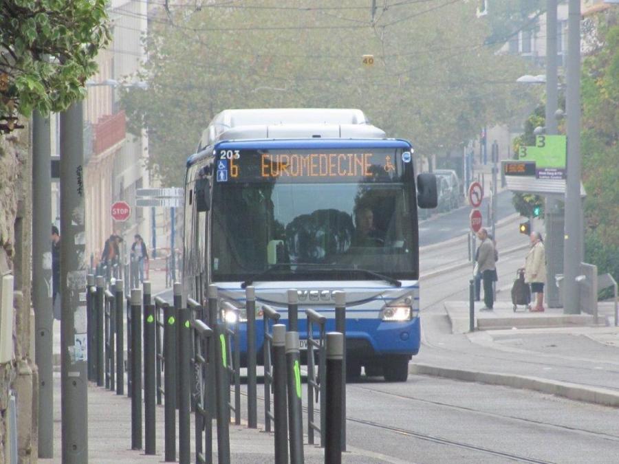 Un bus de la ligne 6 déviée est photographié sur l’avenue de Lodève, peu après la station « Les Arceaux » de la ligne 3 de tramway, le samedi 21 octobre 2017 à 10h17. Copyright : Edouard Paris