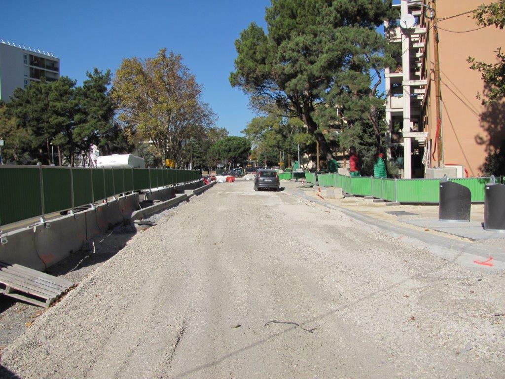 Avancement du chantier de la première ligne de tramway moderne d’Avignon, avenue de la Croix-Rouge, le samedi 28 octobre 2017. Copyright : Edouard Paris