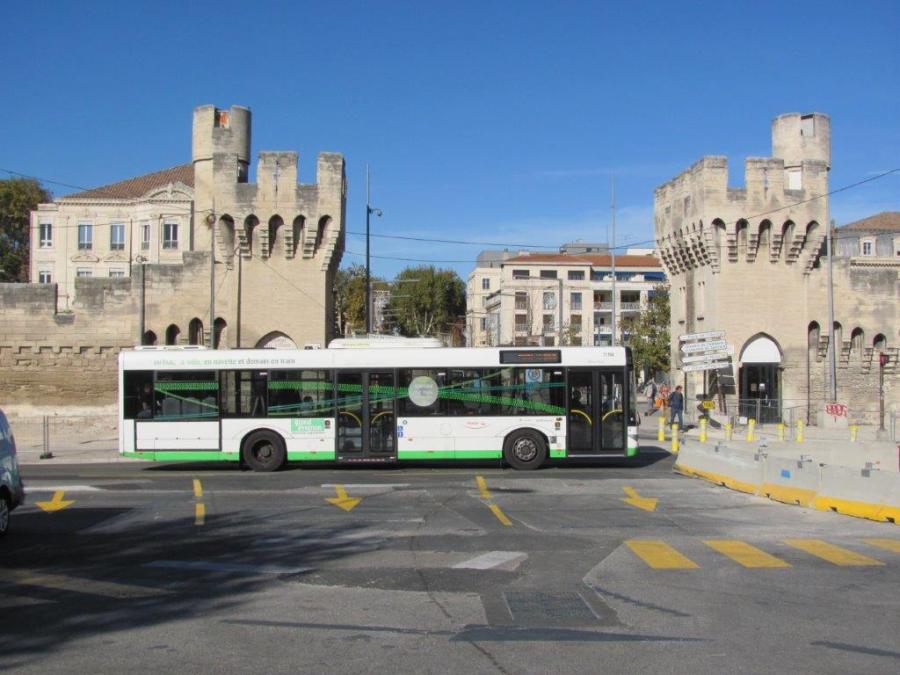 Un bus Urbino 12 Solaris, made in Poland, est photographié à la hauteur de la porte de la République à Avignon, devant laquelle circuleront les rames Citadis Compact Alstom de la première ligne de tramway moderne. Photo prise le samedi 28 octobre 2017. Copyright : Edouard Paris