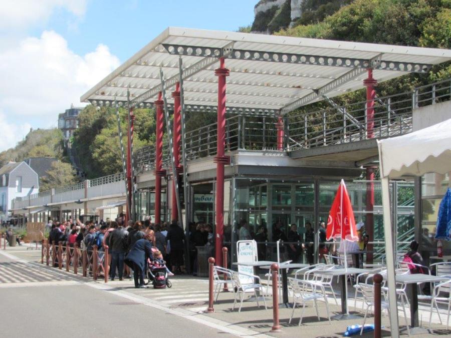 Aperçu de la station inférieure du funiculaire du Tréport, où la foule se presse, le samedi 19 août 2017. Copyright : Edouard Paris