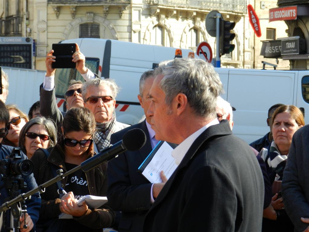« …Je vois que beaucoup d’entre vous font une tête d’enterrement et pourtant un buffet géant nous attend à l’issue de la pose de cette première pierre. » Photo prise le mardi 31 octobre 2017. Copyright : Anje34