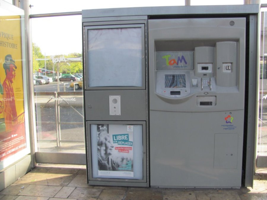 Distributeur automatique de titres de transport de la station « Stade de la Mosson », quai direction « Odysseum », le mercredi 1er novembre 2017. Copyright : Edouard Paris