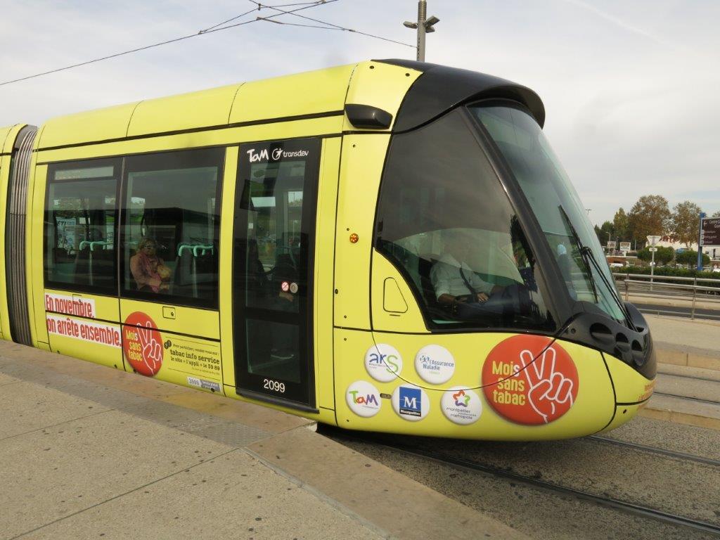 Photographie d’une des deux motrices de la rame 2099 Citadis 402 Alstom à la livrée intégrale « Mois Sans Tabac », à la station « Boirargues » de la ligne 3, le vendredi 3 novembre 2017. Copyright : Edgar Chaptal