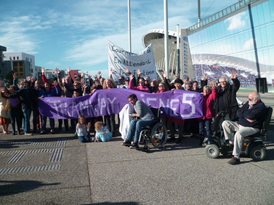 Les partisans de la ligne 5 de tramway se sont retrouvés sur le parvis de l’Altrad Stadium à Montpellier, le dimanche matin 5 novembre 2017, pour dénoncer l’absence de desserte de la ZAC Ovalie par le tramway. Copyright : Edouard Paris