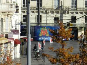 - Photo prise à la volée, depuis la terrasse de la gare Saint-Roch de Montpellier, d’une motrice de la rame 2098 Citadis 402 Alstom multiligne à la livrée intégrale « Cœur de Ville en Lumières » édition 2017, le samedi 18 novembre 2017. Copyright : Anje34