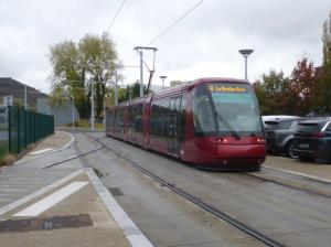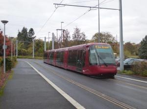 - A Clermont-Ferrand, la rame 1 STE4 Translohr quitte le terminus « La Pardieu Gare », le lundi 6 novembre 2017. Copyright : Michel Bozzola