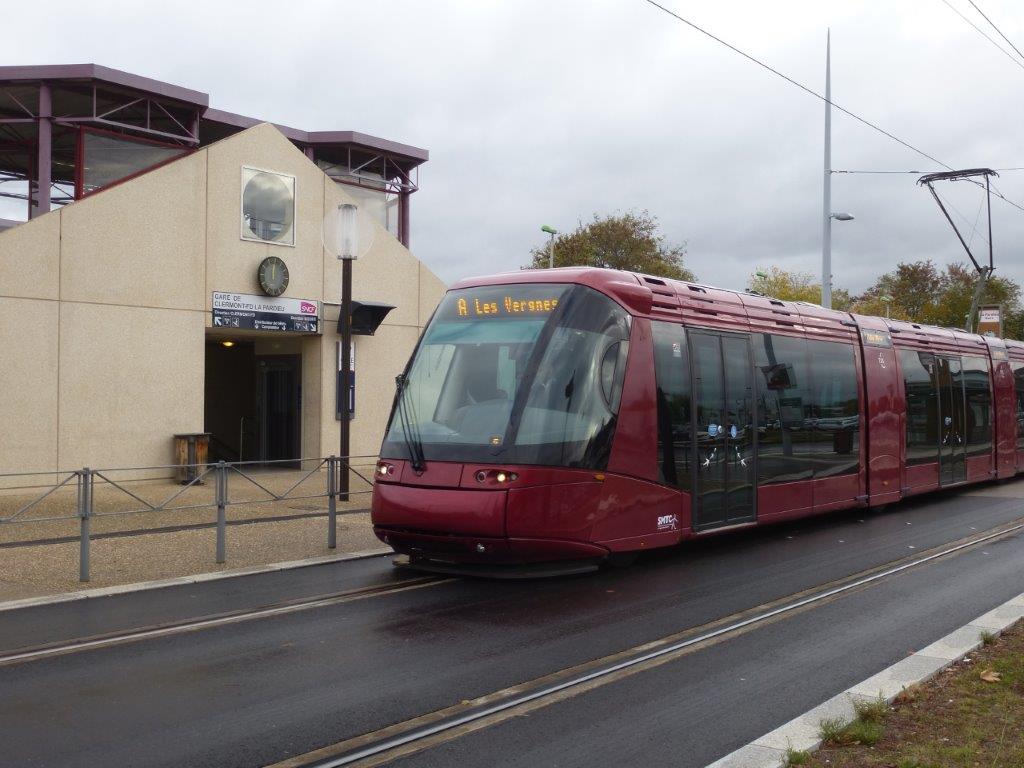A Clermont-Ferrand, la rame 1 STE4 Translohr quitte le terminus « La Pardieu Gare », le lundi 6 novembre 2017. Copyright : Michel Bozzola