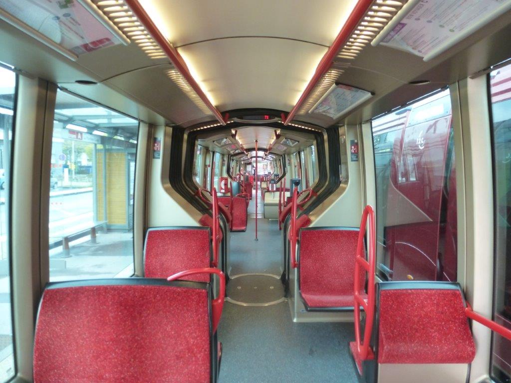 Aménagement intérieur d’une rame STE4 Translohr de Clermont-Ferrand, ici la 9, photographié le lundi 6 novembre 2017. Copyright : Michel Bozzola