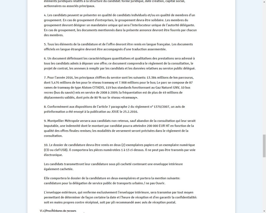 Capture d’écran d’un extrait de l’appel d’offres de la délégation de service public pour l’exploitation de services de transports publics urbains de Montpellier Méditerranée Métropole publié le jeudi 2 mars 2017 (dimanche 19 novembre 2017)
