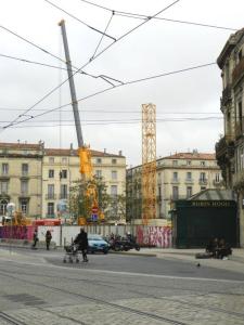 Trois semaines après la cérémonie officielle de la pose de la première pierre des nouvelles halles Laissac, place Alexandre-Laissac à Montpellier, la grue de chantier était en cours de montage ce mercredi 22 novembre 2017, alors que le calendrier des travaux annonçait cette étape pour le début de ce mois de novembre.