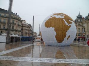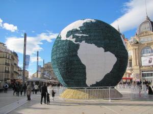 - Les voyageurs des lignes 1 et 2 de tramway peuvent apercevoir la boule mappemonde installée sur la place de la Comédie à l’occasion des fêtes de fin d’année. Photo prise le samedi 6 décembre 2014. Copyright : Edouard Paris
