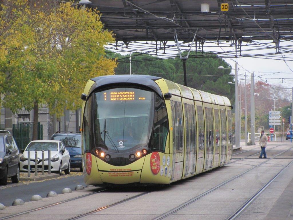 La rame 2099 Citadis 402 Alstom, revêtue de la livrée intégrale « Mois Sans Tabac », est photographiée peu après son départ de la station « Stade de la Mosson » de la ligne 1, en direction du terminus « Odysseum », le samedi 25 novembre 2017. Copyright : Edouard Paris