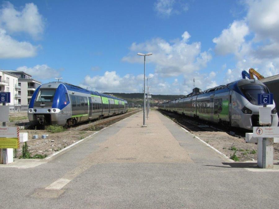 Des automotrices de dernière génération sur des voies en mauvais état photographiées en gare du Tréport – Mers les Bains, le samedi 19 août 2017. Copyright : Edouard Paris