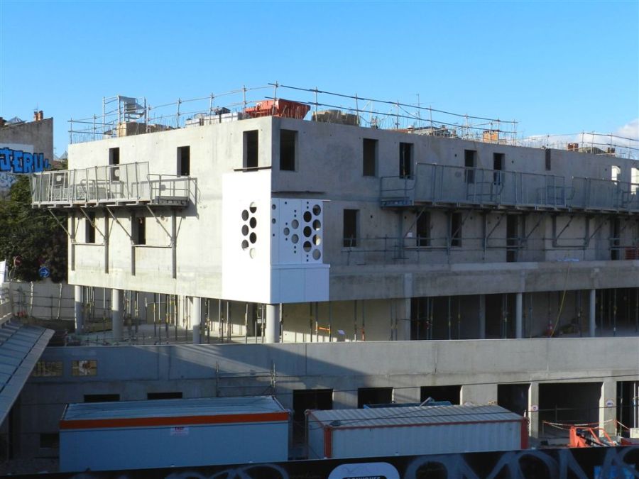 Premiers éléments décoratifs appliqués sur deux façades de l’ensemble architectural « Hôtel St-Roch – Belaroia » en cours de construction photographiés le vendredi 1er décembre 2017. Copyright : Anje34