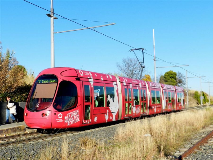 La rame 2048 Citadis 302 Alstom multiligne, à la livrée « La Sunny French Tech Attitude », est photographiée à la station « La Condamine » de la ligne 2, commune de Saint-Jean-de-Védas, le mardi 5 décembre 2017. Copyright : Anje34