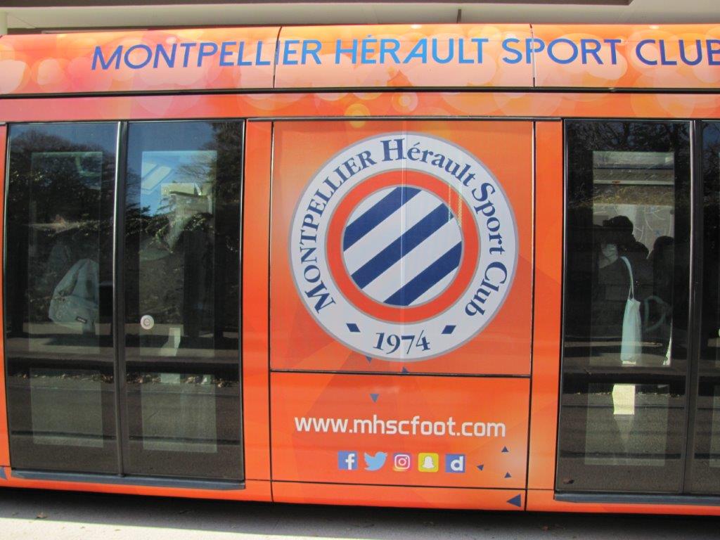 L’emblématique blason du Montpellier Hérault Sport Club (MHSC) appliqué sur le module central de la rame 2099 Citadis 402 Alstom multiligne photographié à la station « Stade Phillipidès » de la ligne 1, le samedi 9 décembre 2017. Copyright : Edouard Paris