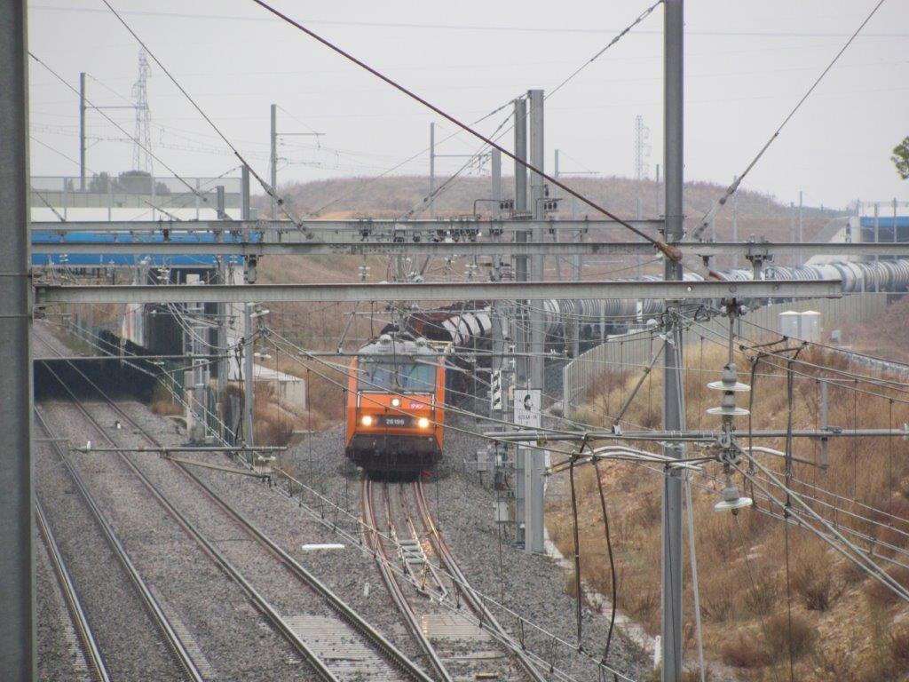 Un train de fret, BB 26196 Sybic GEC Alsthom en tête, est photographié sur la bretelle de sortie du contournement ferroviaire de Nîmes et Montpellier (CNM), le dimanche 10 décembre 2017, à 15h13. Copyright : Edouard Paris