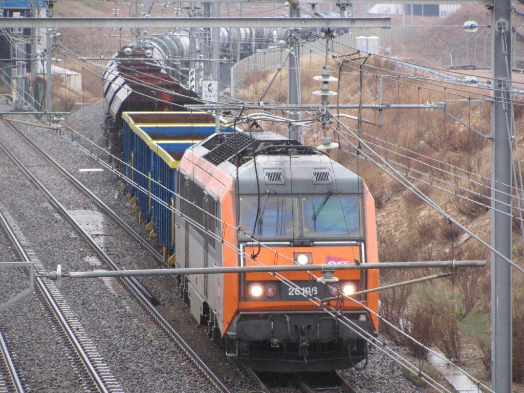 Gros plan sur le train de fret, BB 26196 Sybic GEC Alsthom en tête, qui vient d’étrenner le contournement ferroviaire de Nîmes et Montpellier (CNM), le dimanche 10 décembre 2017. Copyright : Edouard Paris