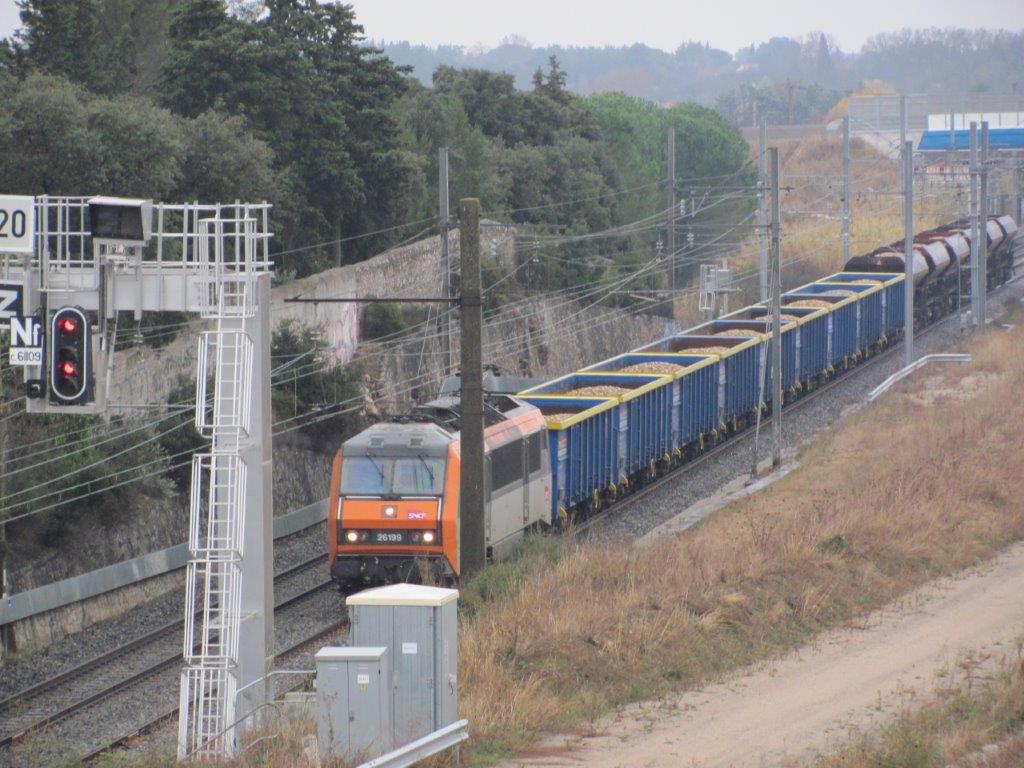Un train de fret, BB 26199 Sybic GEC Alsthom en tête, poursuit son chemin sur la ligne classique en direction de Montpellier, à la hauteur du hameau de la Jasse de Maurin à Lattes, le dimanche 10 décembre 2017 à 15h18. Copyright : Edouard Paris