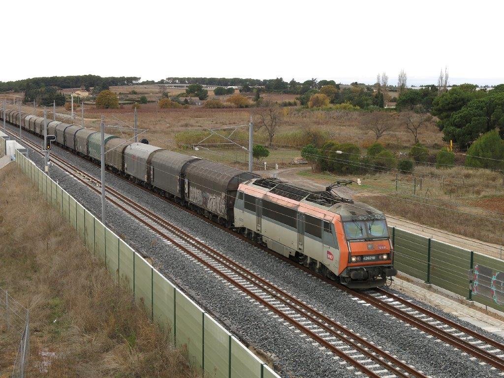 Un train de fret assurant la liaison Perpignan – Miramas, BB 26218 Sybic GEC-Alsthom en tête, est photographié sur le contournement ferroviaire de Nîmes et Montpellier (CNM), commune de Mauguio, le mardi 12 décembre 2017 à 14h03. Copyright : Edgard Chaptal