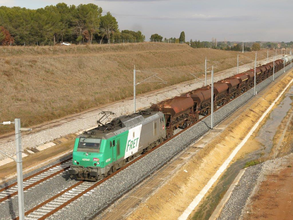 Un train assurant la liaison Miramas – St-Jory, BB 27047 Alstom en tête, est photographié sur le contournement ferroviaire de Nîmes et Montpellier (CNM), depuis le pont du chemin de la Banquière, commune de Mauguio, le mardi 12 décembre 2017 à 15h18. Copyright : Edgar Chaptal