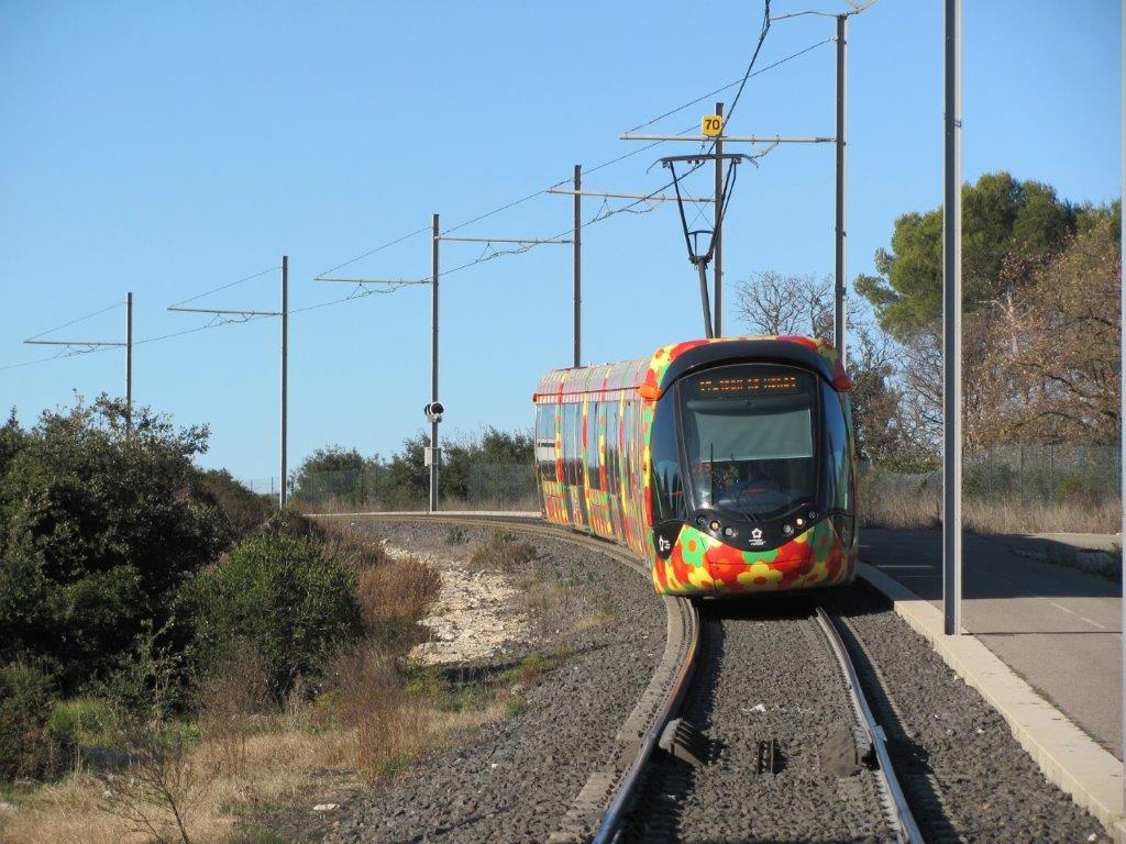 Une des cinq rames Citadis 402 Alstom opérant sur la ligne 2 est photographiée sur une section à voie unique équipée de rails vignole entre les stations « Georges Pompidou » et « Via Domitia » à Castelnau-le-Lez, le samedi 7 janvier 2017. Copyright : Edouard Paris