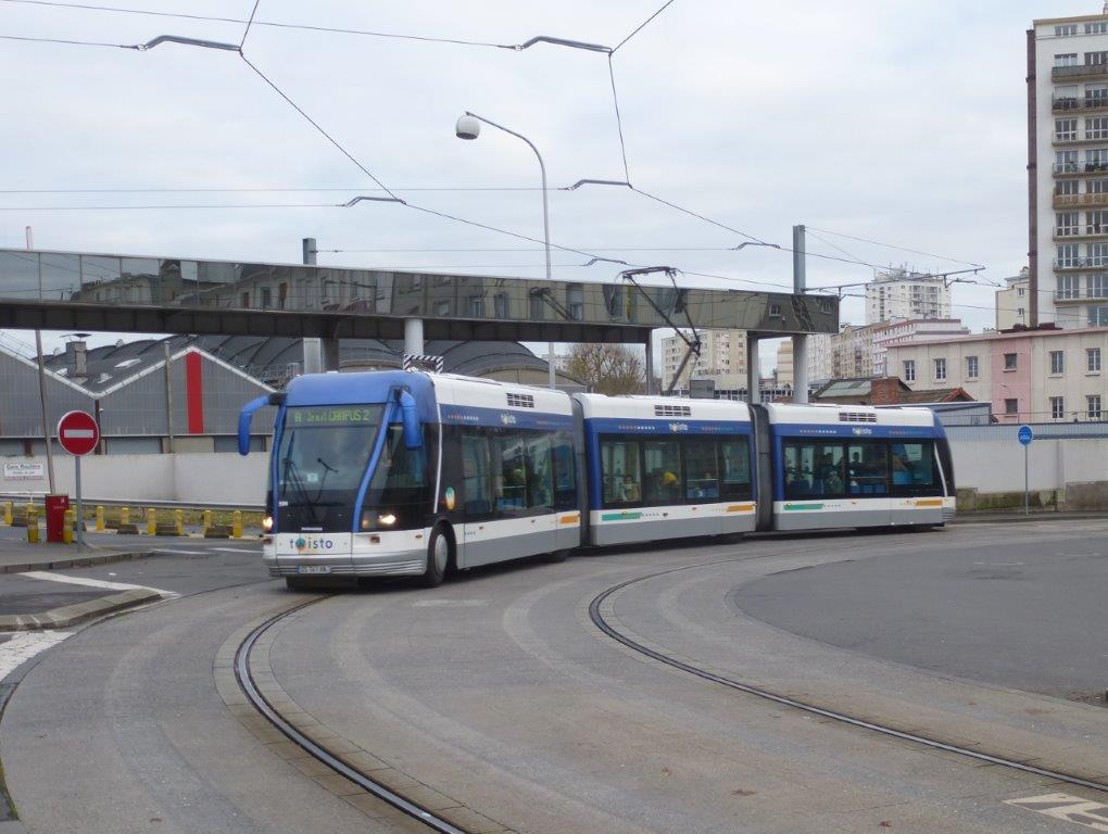 A Caen, la rame 506 TVR Bombardier est photographiée dans le virage de la gare, le mardi 5 décembre 2017. Copyright : Michel Bozzola