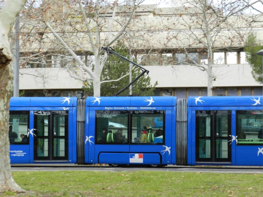 « Région Occitanie / Pyrénées – Méditerranée », troisième nom de baptême de la rame 2027 Citadis 401 Alstom opérant sur la ligne 1 de tramway de Montpellier. Photo prise le mardi 2 janvier 2018. Copyright : Anje34