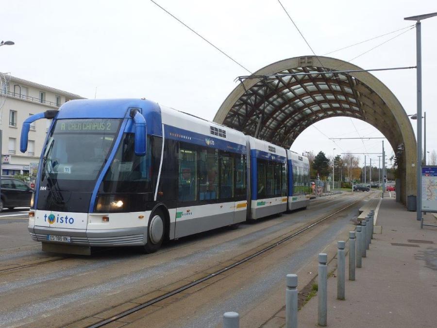 Photographie du terminus sud de la ligne A « Ifs Jean Vilar », où la rame 504 TVR Bombardier se dirige vers la boucle de retournement avant de repartir pour le terminus nord de cette même ligne A « Caen Campus 2 », le mercredi 6 décembre 2017. Copyright : Michel Bozzola