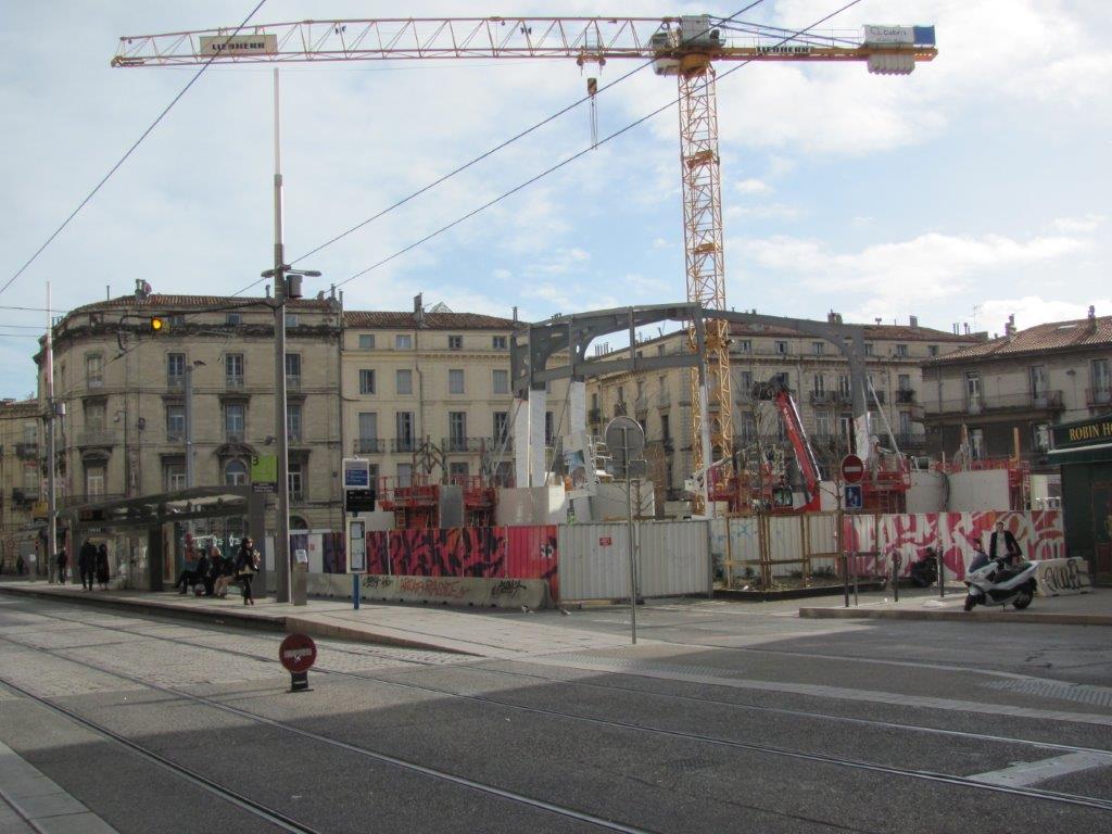 La station « Observatoire », commune aux lignes 3 et 4 de tramway, jouxte le chantier des nouvelles halles Laissac à Montpellier. Photo prise le lundi 1er janvier 2018. Copyright : Edouard Paris